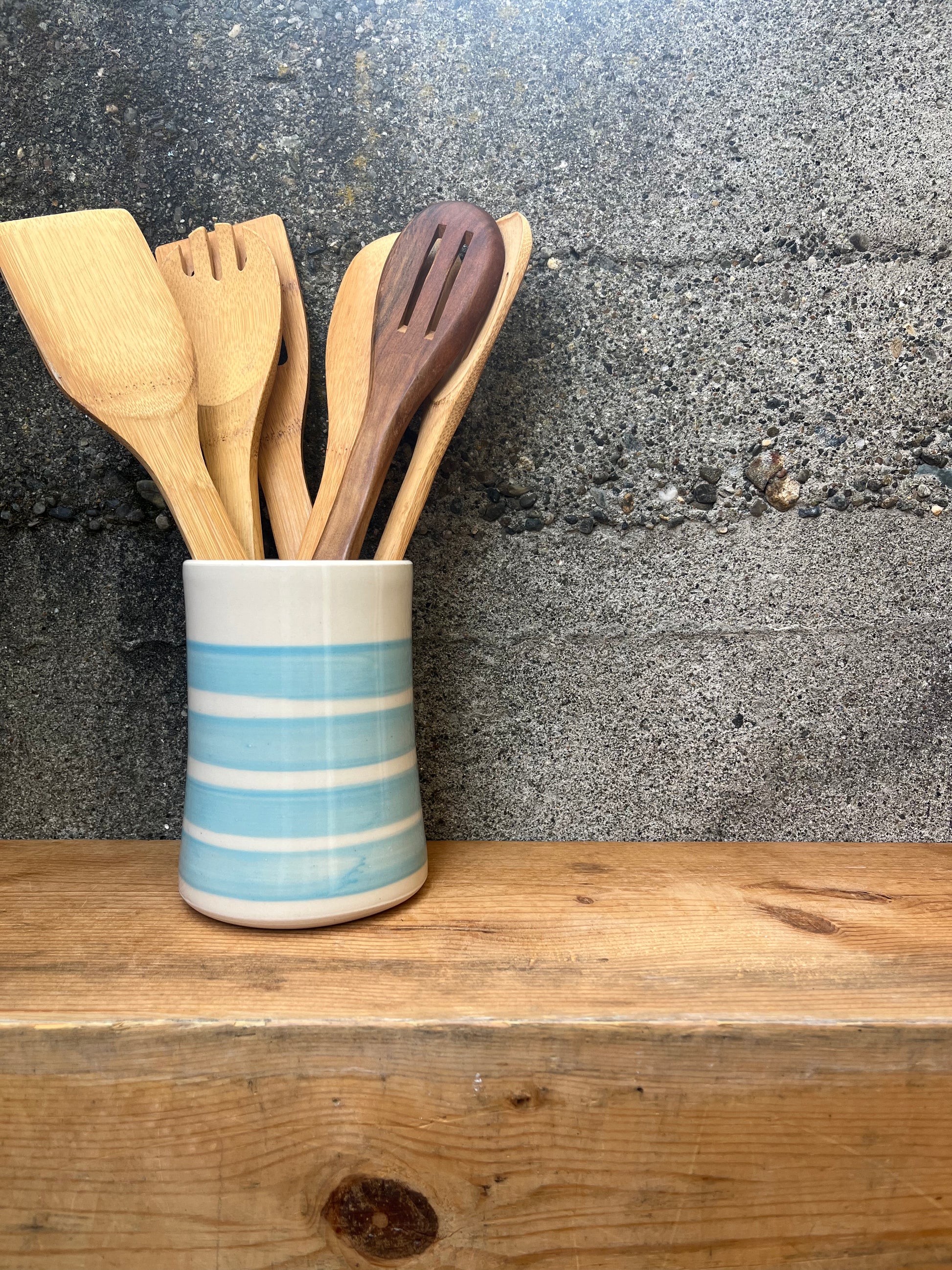 Wheel thrown, hand made, and banded with stained slip - finished in a creamy clear glaze. These smaller-than-my-usual utensil holders stand roughly 5.5-6" tall by 3.5" wide at the rim. The narrow rim means this vessel would also work to hold a bouquet.