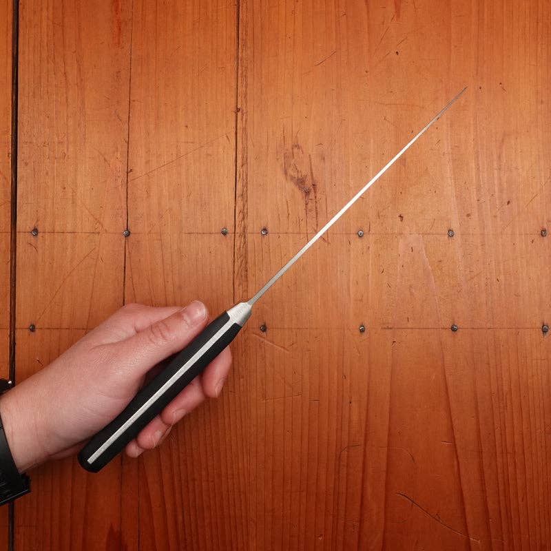 6" drop forged stainless steel utility knife with riveted black POM handle with Pikas Spade insignia. Friedr. Herder Abr Sohn company is the longest continually operating knife making operation in Solingen Germany. It’s famous Pikas spade logo was registered in 1727 although their place in Solingen’s blade making traces further back. Friedr Herder has kept many old patterns in carbon steel in production and offers a variety of new production knives for professionals and home cooks. We are happy to include these in our lineup. When looking for old knives seeing that Herder handle with the spade rivet peeking out is always exciting, we think it’s still true of the new production knives as well.