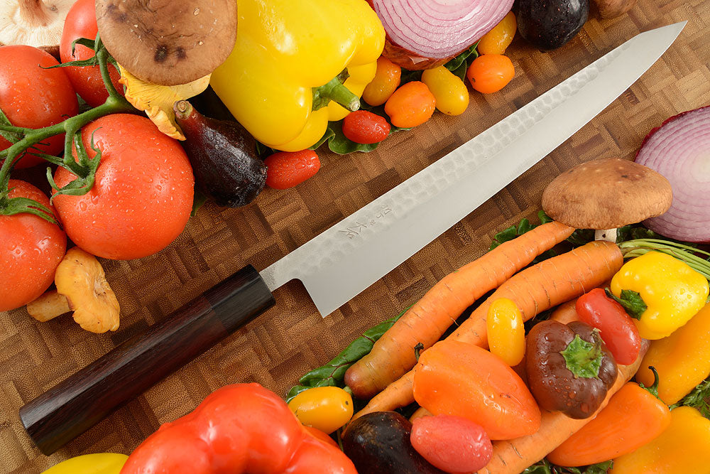 Sujihiki are slicers or carving knives that are well suited for slicing and portioning meats and fish due to the thin, long blade. Extremely sharp, they are also well suited to preparing sushi and sashimi. The extended blade length allows you to slice with one long stroke, instead of sliding the knife back and forth in a sawing motion. The result is a superior, clean cut.