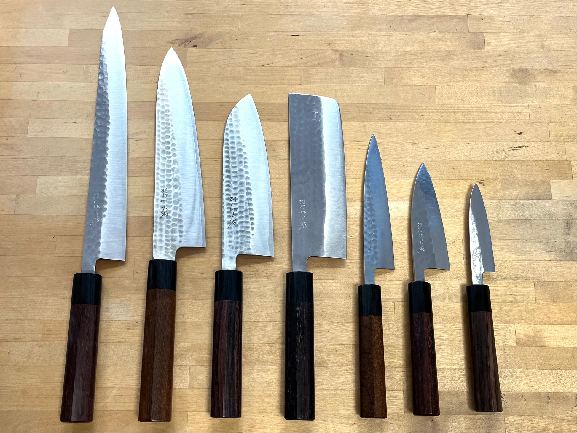 Hiragatake chef's knives, hand forged in Sanjo, are terrific performers. The stainless steel blade is forged using the san mai technique - a hard steel forms the cutting edge and is sandwiched between softer layers of steel. This results in a strong knife with very long edge holding. The core steel is SLD, an incredibly high performing stainless steel. It was heat treated to Hrc 64 (very hard!) This is clad with soft stainless steel sides.