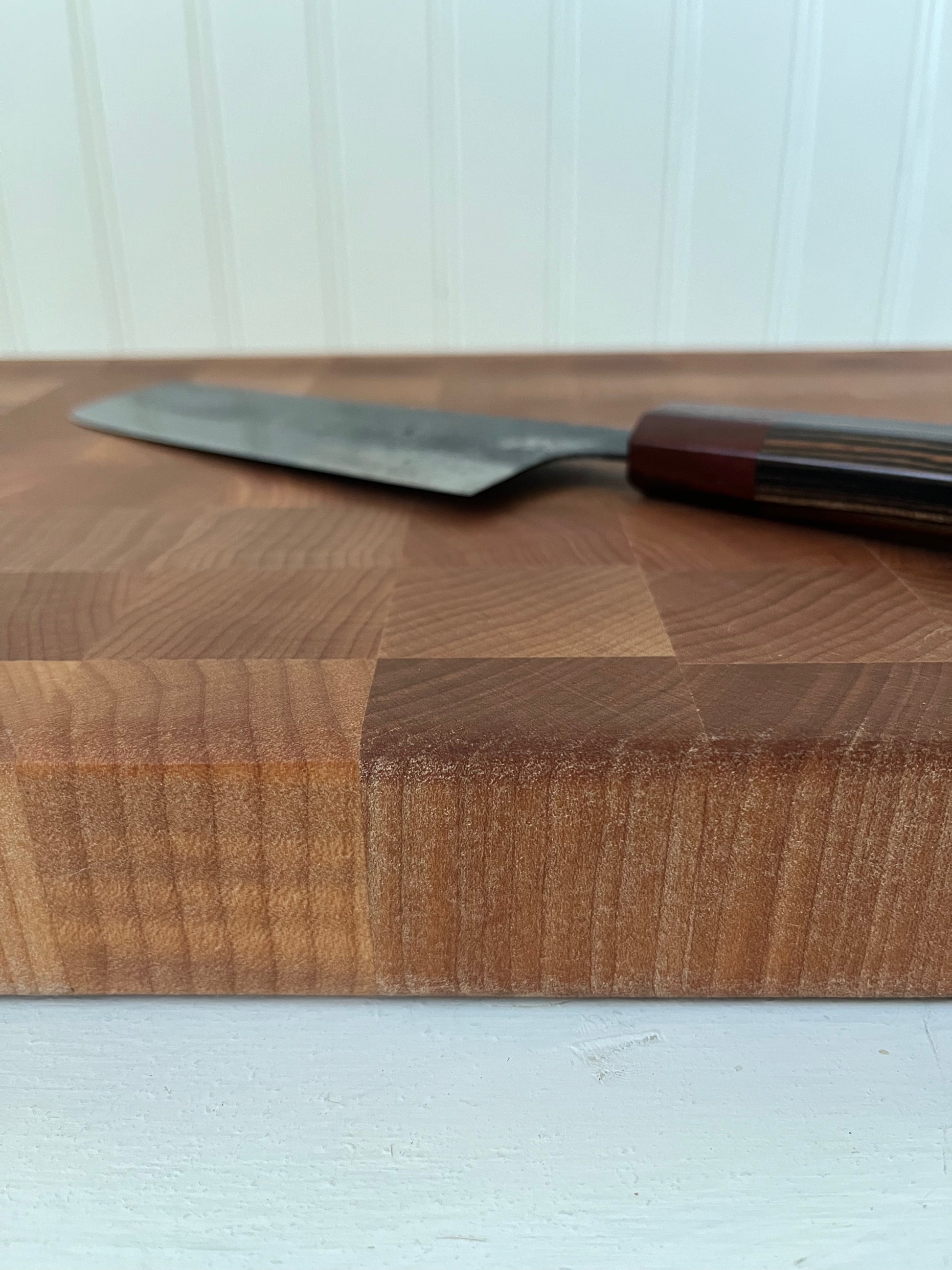 Solid end-grain cutting boards combine old-world craftsmanship with sustainable modern techniques. Smaller pieces of wood are joined together with precision, creating a durable cutting surface with a unique and striking pattern. Whether you're looking to add warmth to a clean modern design or match the rustic tones of classic wood cabinets these cutting boards will look great for years. End-grain boards are considered to be the finest available because your knife penetrates between the wood fibers, rather than cutting them, which shows less wear and preserves the sharp edge of your knife.