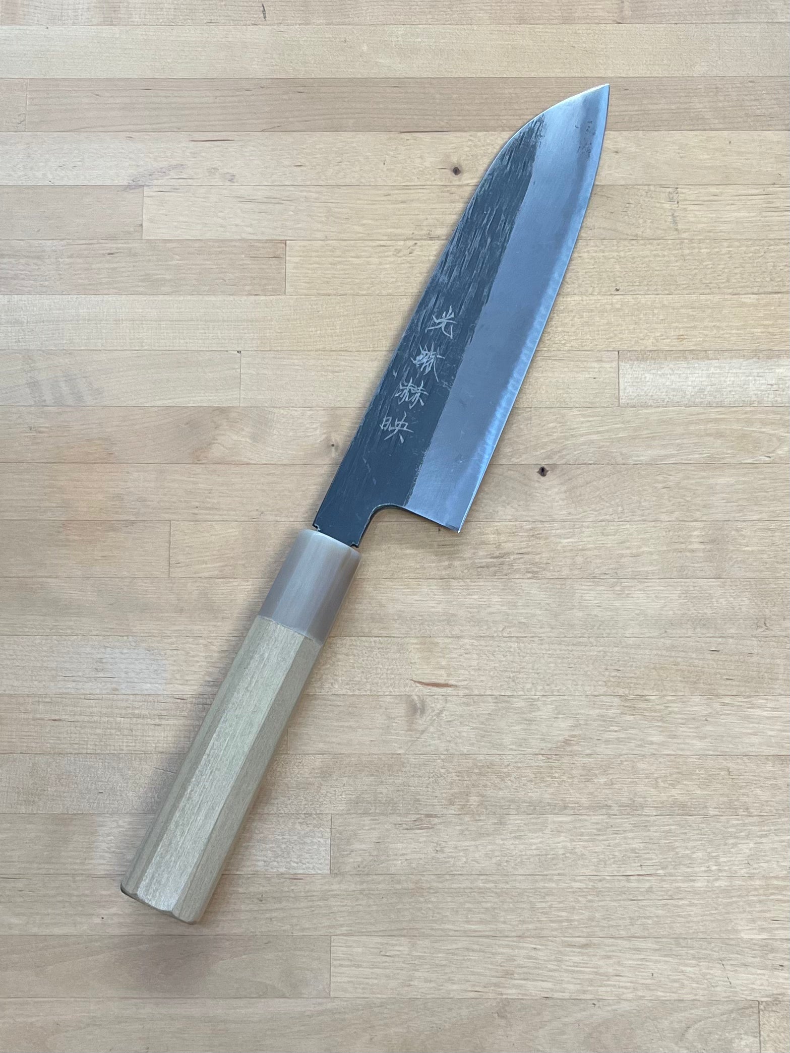 The Korin Kaguya (赫映) is made in the kurouchi forging style, where the blacksmith leaves a portion of the blade unpolished after the tempering process (yaki-ire). The kanji characters in Kaguya mean projection of flames, and alludes to the image of the blacksmith crafting this blade. In recent years, this austere blade exterior has become wildly popular for their unpretentiously chic aesthetic. Additionally, carbon steel blade enthusiasts in particular tend to appreciate how any discoloration is less noticeable. The 50/50 symmetrical blade is constructed out of white #2 carbon steel, then adorned with a traditional Japanese magnolia handle with a unique buffalo horn bolster.
