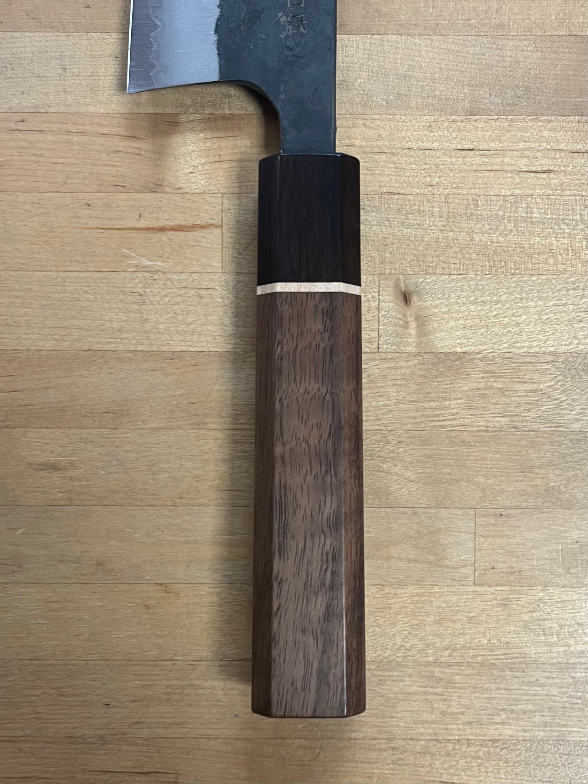 This hand-forged Bunka has a blade length of 170mm. It was forged in traditional handwork by Tanaka-san from the Matsubara forge in Japan. The Bunka has a Kurouchi finish which results from the 3-layer blade structure, consisting of the softer sheath steel and the very hard inner core steel, which forms the cutting edge of the knife.