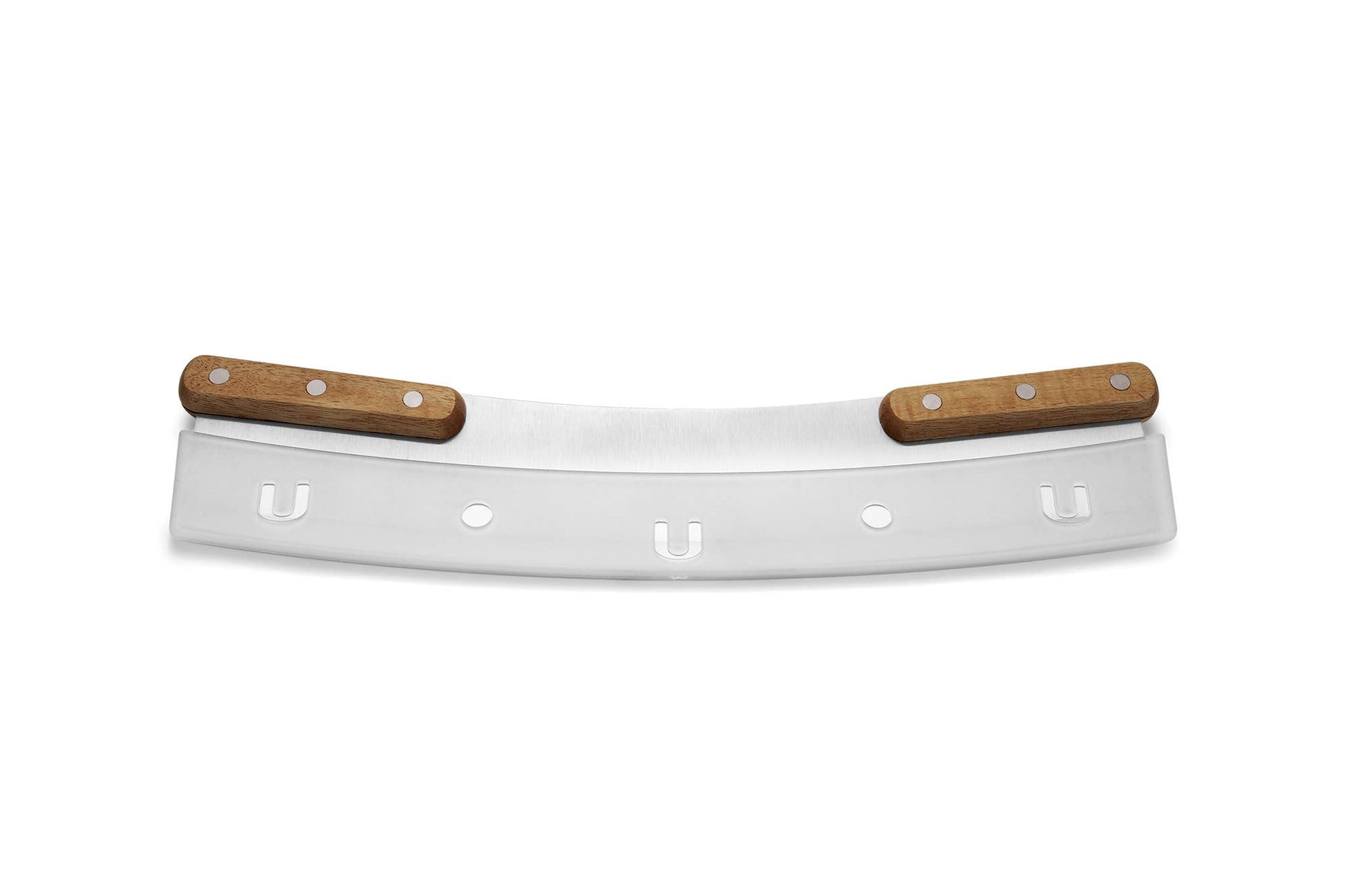 DURABLE DESIGN: This pizza rocker comes with a beautiful acacia wood handle with a blade made in the artisan craftsmen style of knife makers of years ago. Plus, it comes with a bonus clear polycarbonate edge protector as well.