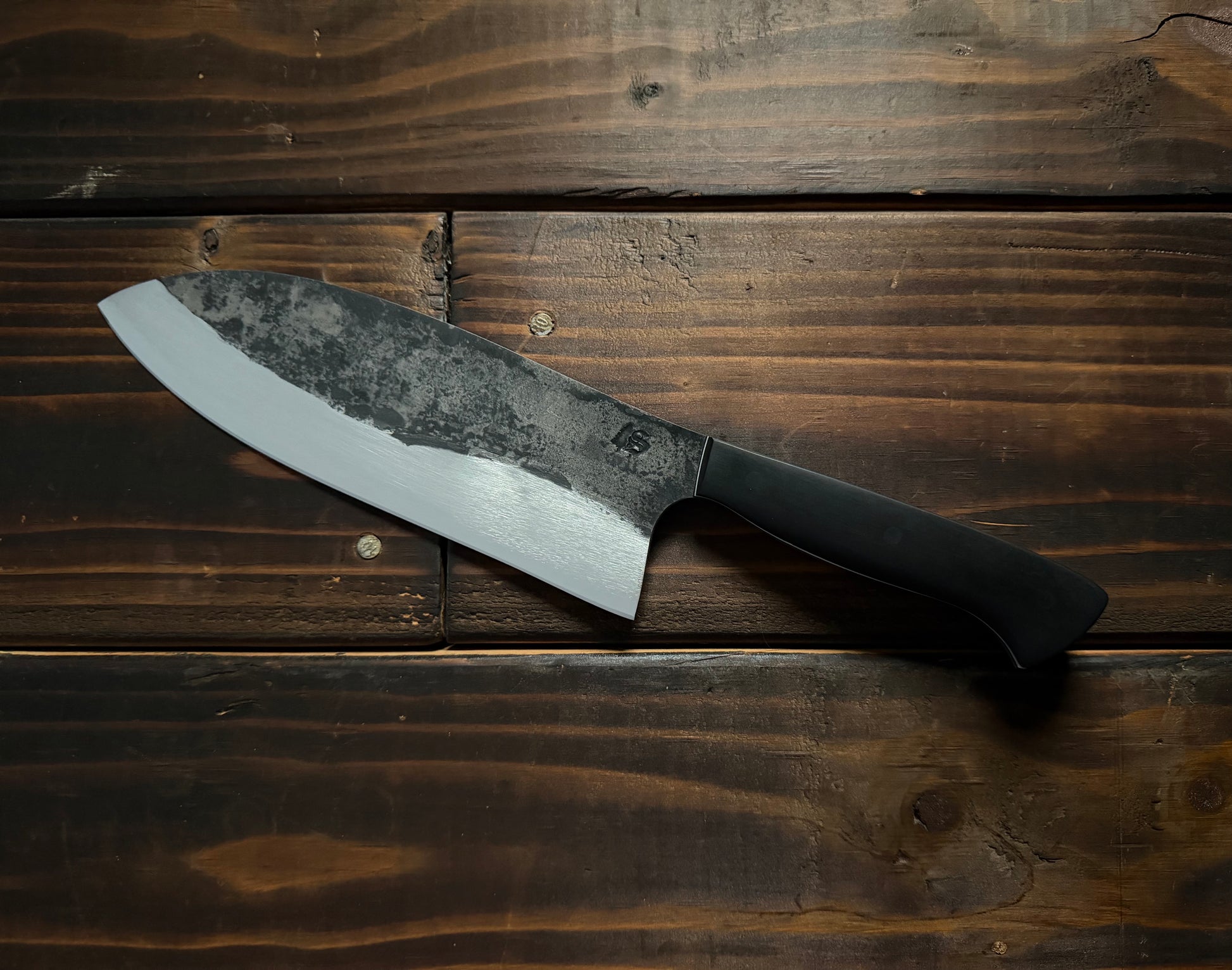 Looking for a unique one of a kind kitchen tool that is large, agile and sharp enough for everyday tasks and tough enough to chop through anything you throw at it? This hybrid blade was inspired by taking the toughness of a cleaver and then putting a santoku point on the tip of the blade to make it much more versatile.